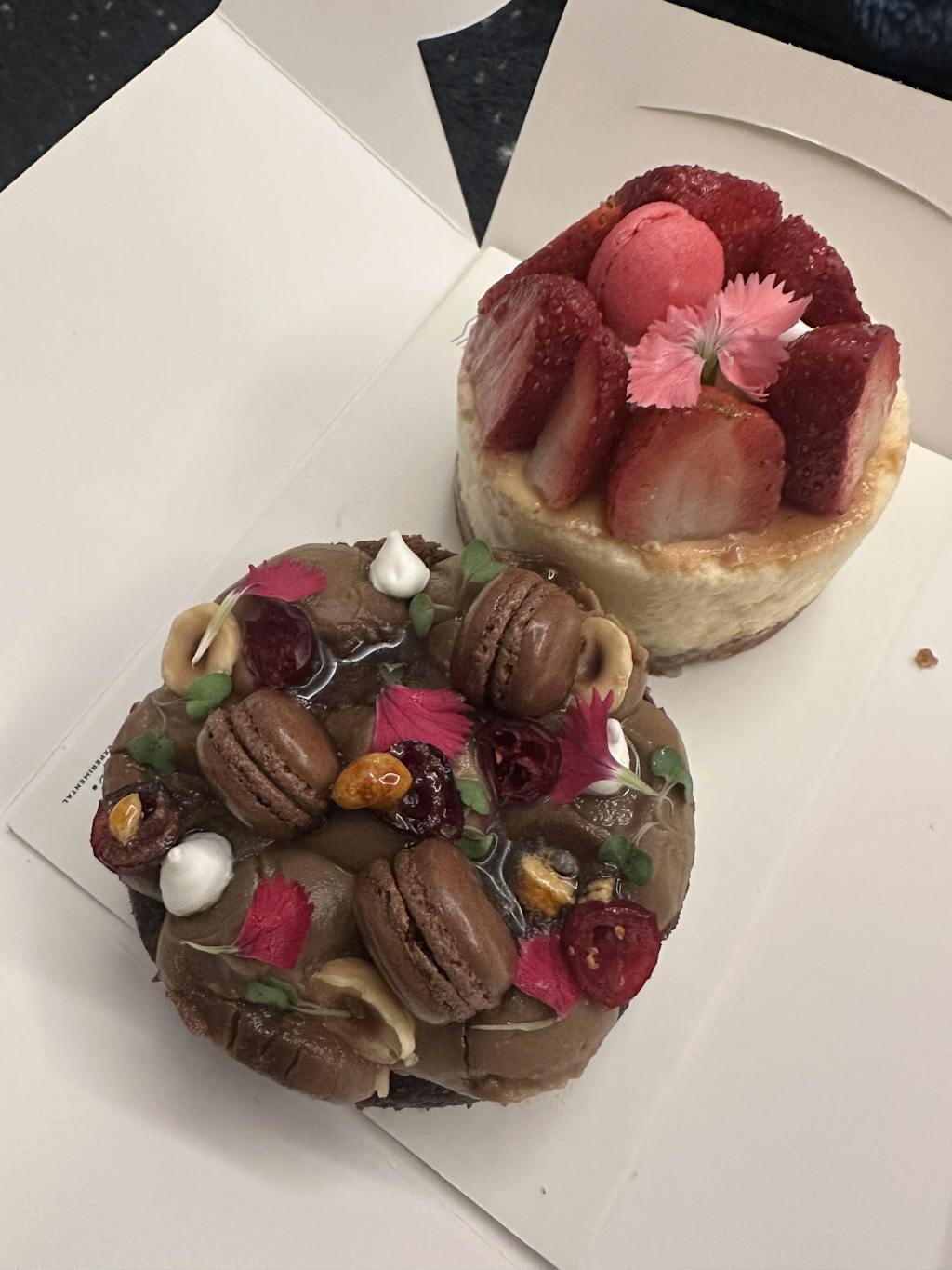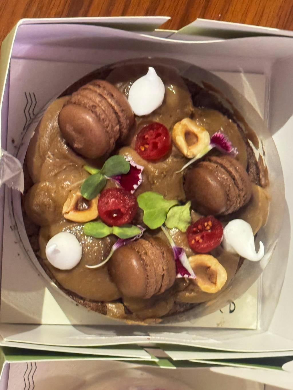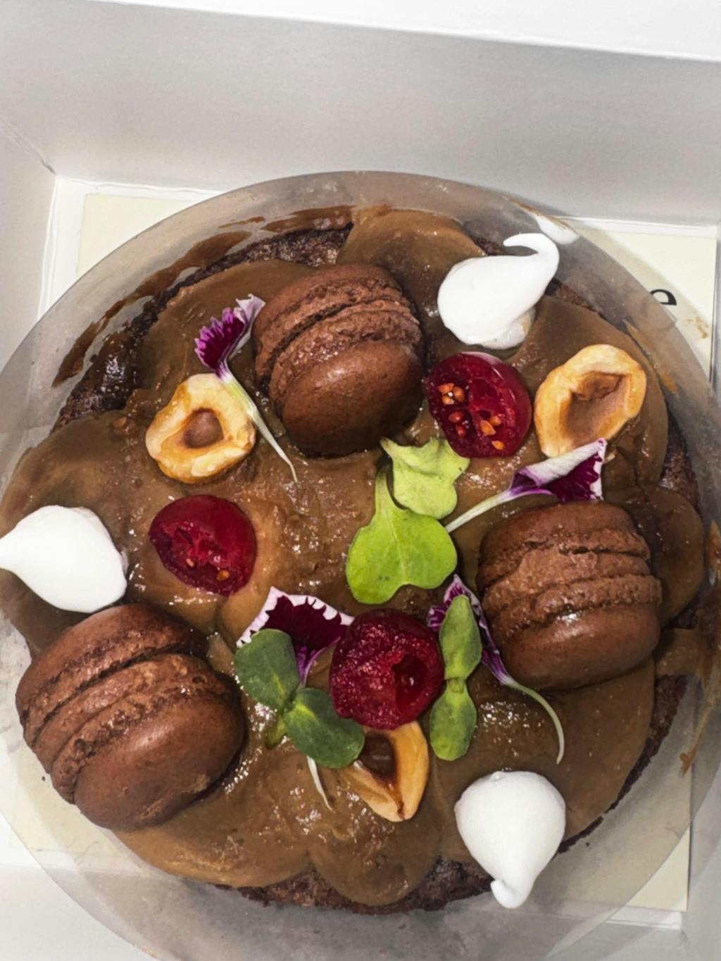 A light, flourless chocolate cake finished with Coffee Bean Cremeux, chocolate macarons, honeycomb & roasted Hazelnuts.