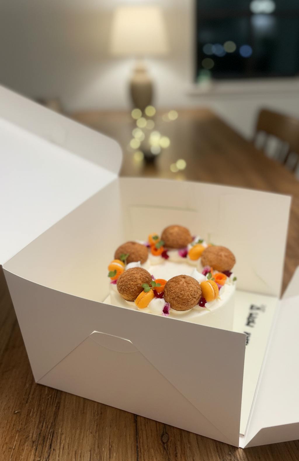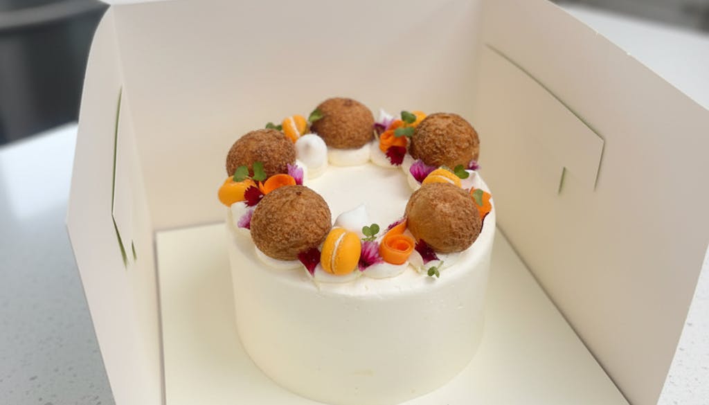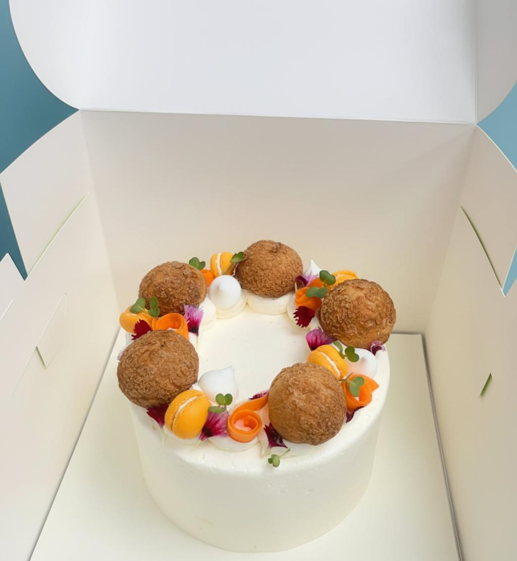 A moist Carrot cake layered with Salted caramel and a light Cream cinnamon cheese frosting, finished with salted caramel Choux buns, streusel, macarons, meringue & Carrot ribbons.