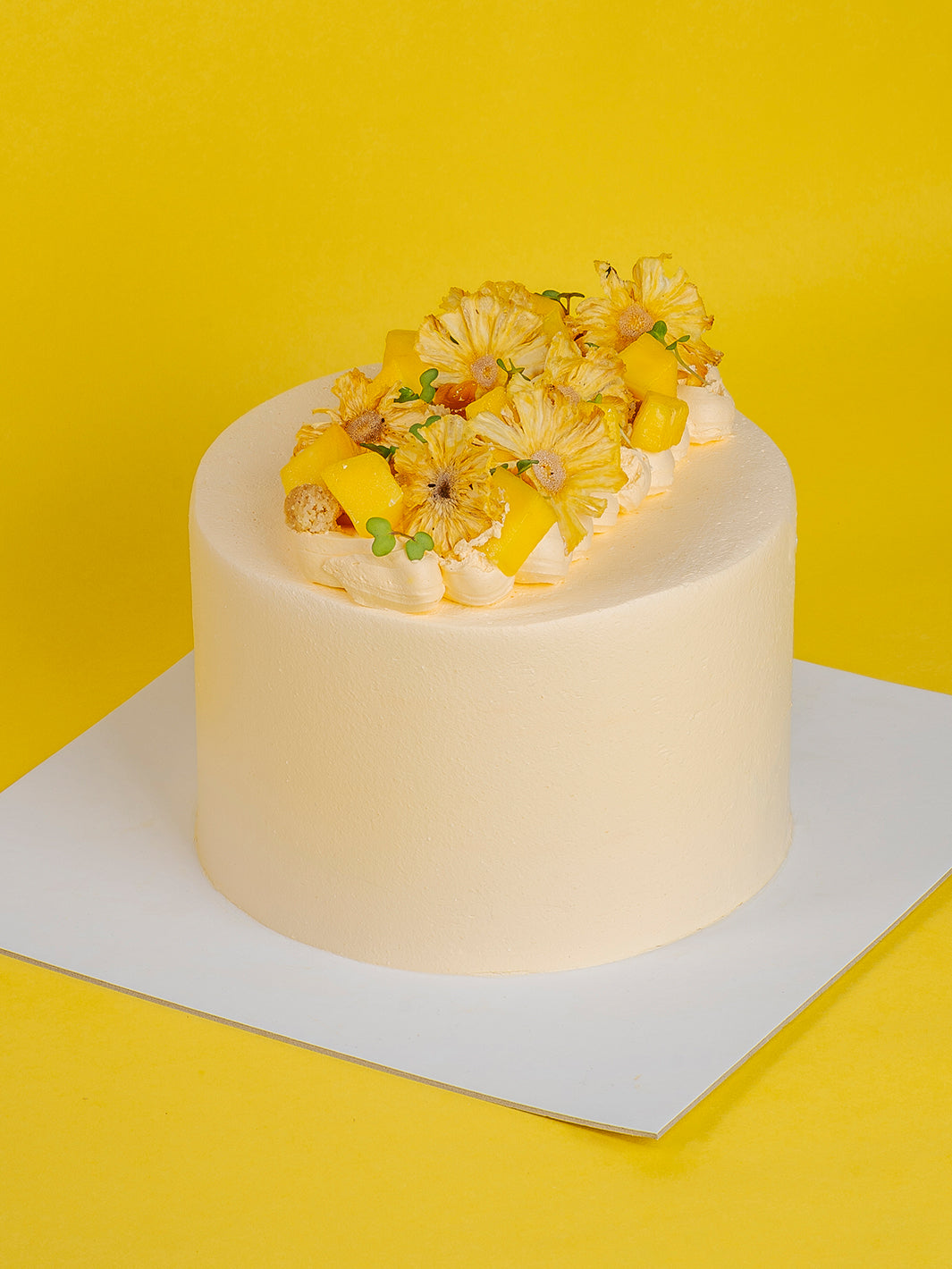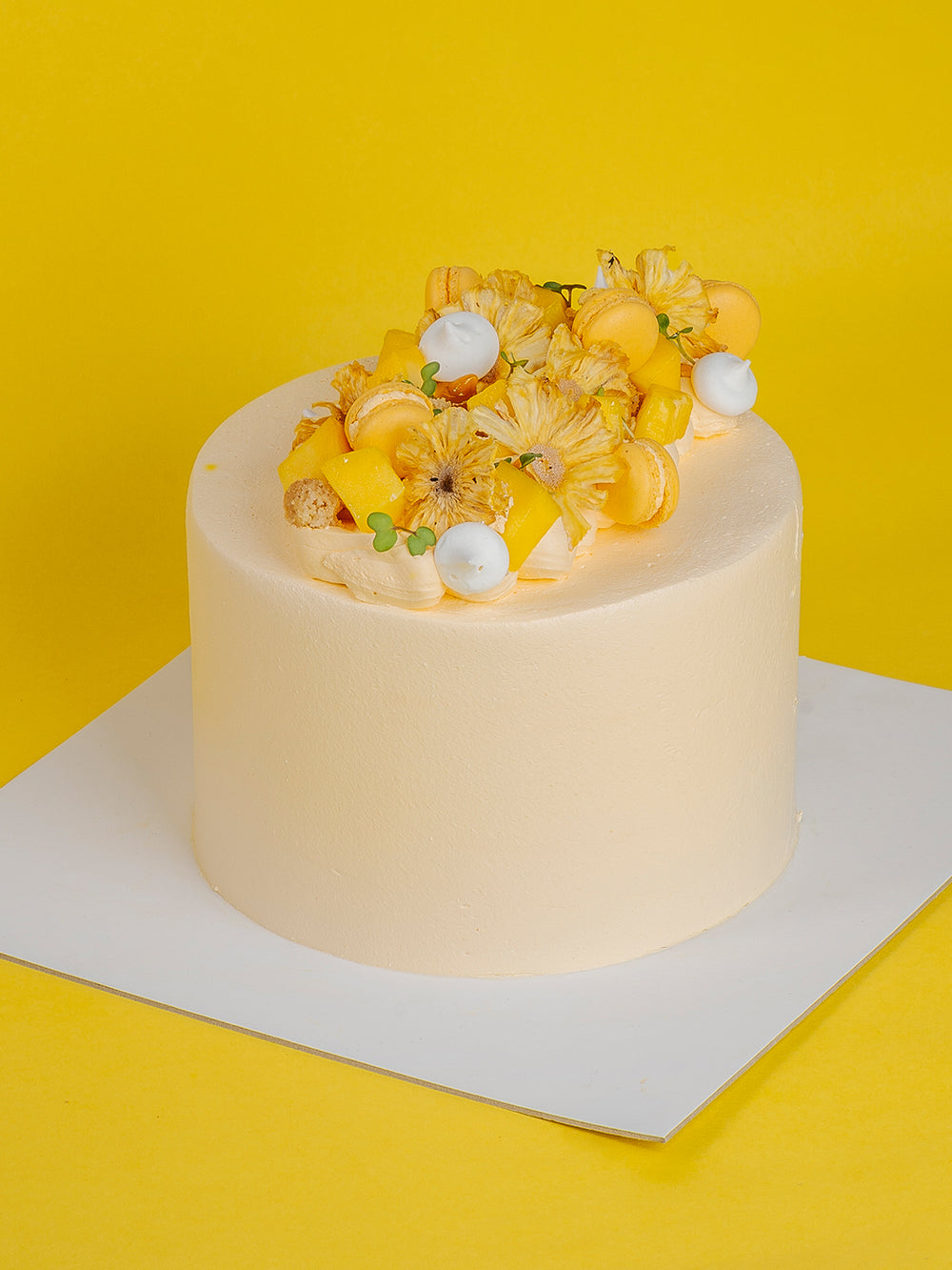Vanilla sponge soaked with a tangy Passionfruit syrup, layered with a rich vanilla custard cream, Fresh mango chunks & pineapple compote.